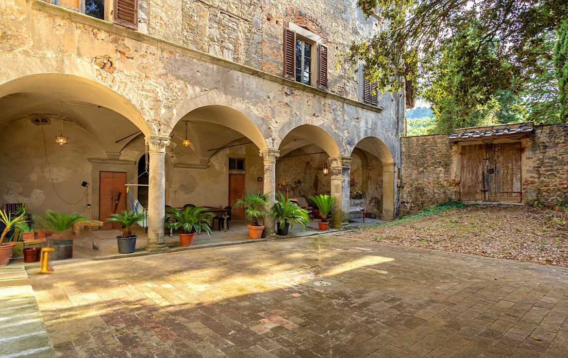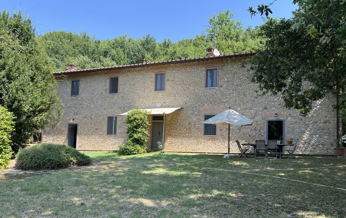 A fascinating Tuscan farmhouse located on a splendid panoramic position, finely restored. The old stone walls have been recovered, floors enriched with elements of the highest quality style, traditional wooden-beamed ceilings, and ancient fireplaces to maintain an authentic Tuscan style. The property consists of 3 units easily redesigned to one. The main house of 450 sqm has two living rooms with fireplaces, a large kitchen, and a powder bathroom on the ground floor; there are three bedrooms and two bathrooms on the first floor.