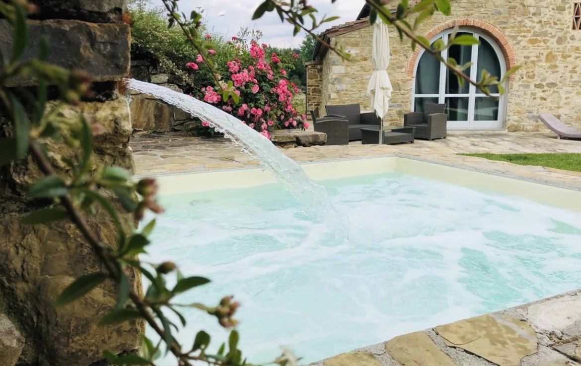 The property also boasts a stunning swimming pool, complete with a jacuzzi area and a characteristic fountain, making it an ideal place to relax and unwind, surrounded by the lush countryside.